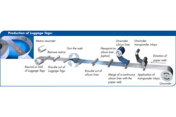 Web finishing solutions: integration of intelligent data inlays into paperThe VARIWEB can be used for the integration of a large variety of transponder inlays (i.e. RFID) into paper. Intelligent paper products like Smart Labels, Smart Luggage Tags, or Smart Tickets simplify and control complete production and supply chains of goods and can also be used for personal identification. smart label processes - RFIDluggage tag processes - RFID |